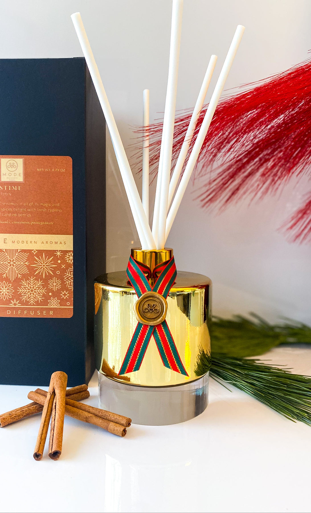 The set of 3 includes our CHRISTMASTIME fragrance in: a gold reed diffuser, a 17oz red geometric vessel candle, and a home fragrance mist. Offered together at a value price.